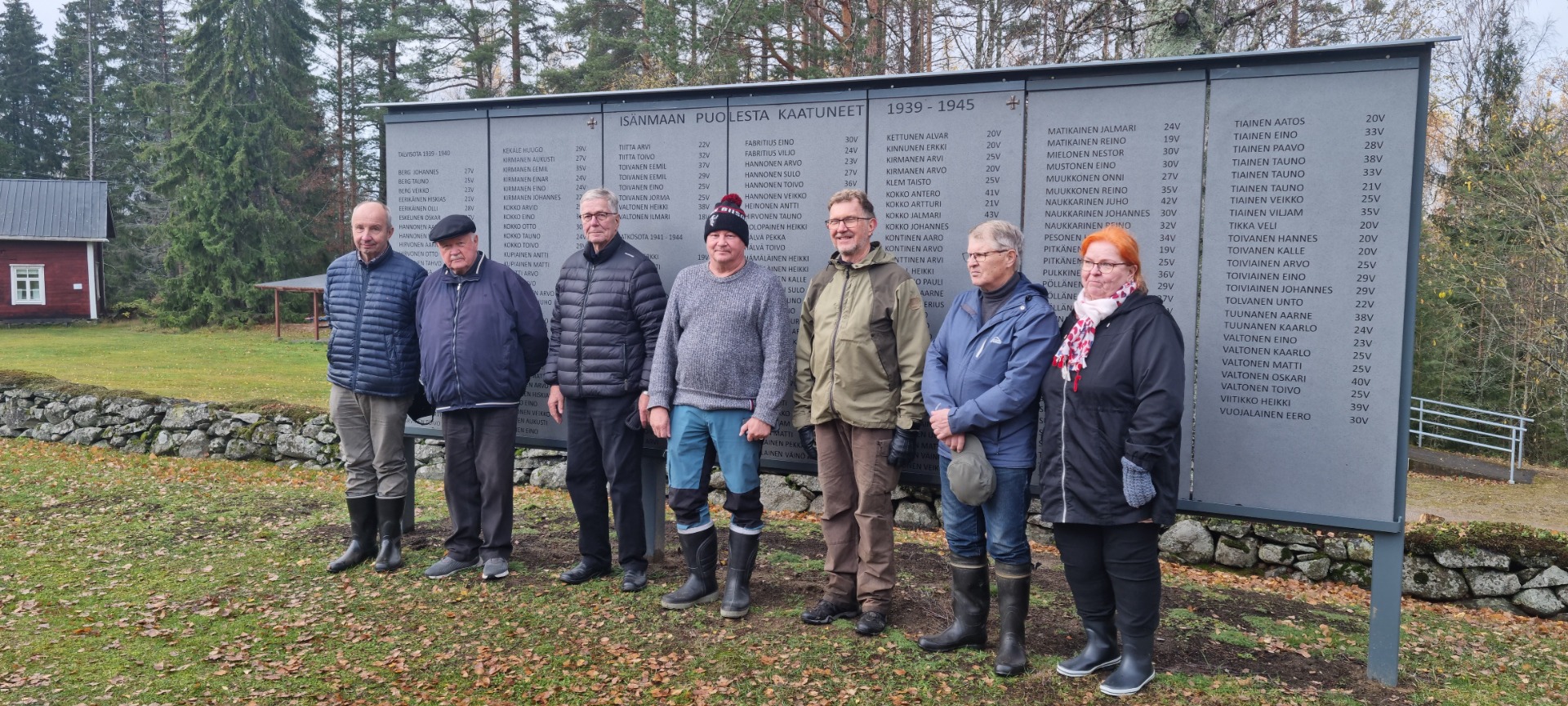 Suoritimme 27.10. loppukatselmuksen Pro Patria -muistomerkillä. Hanke todettiin loppuunsaatetuksi ja valmiina luovutettavaksi Parikkalan Seurakunnan haltuun. Kuvassa vasemmalta kirkkovaltuuston puheenjohtaja Kyösti Niiranen, rovasti Erkki Lemetyinen, TVUP:n pj Veikko Junna, kirkkoneuvoston jäsenet Matti Laukkanen ja Arto Valkeapää, kirkkoneuvoston vpj. Juha Anttonen ja srk:n talouspäällikkö Teija Paakknen.