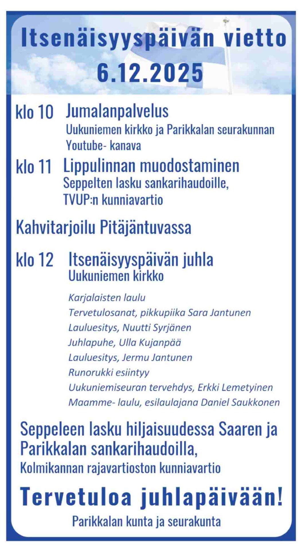TVUP suoritti seppeleenlaskun ja kunniavartion Uukuniemen sankarihautausmaalla. Seppeleenlaskijoina toimivat ltn evp Martti Riekki ja vänr res Matti Laukkanen. Kunniavartiossa olivat ltn res Paavo Kontiokorpi ja ylik res Matti Ropponen. Parikkalan kunnan seppeleen laskijana toimi myös kunnanvaltuuston puheenjohtaja vanhempi rajavartija (ja myös ltn res) Maija Valkeapää.