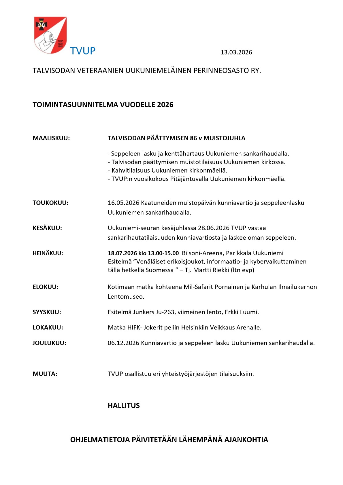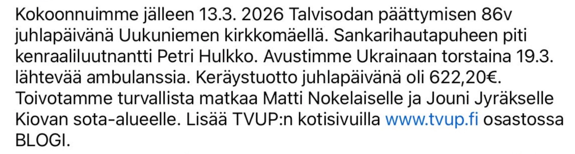TVUP laski seppeleen ja vastasi kunniavartiosta Uukuniemi-juhlassa Uukuniemen sankarihautaus-maalla. Seppeleenlaskijoina toimivat ylil res Veikko Junna ja ylikers res Matti Ropponen. Kunniavartiossa olivat yliv res Kari Tikka ja korpr res Markus Siitonen. Juhlapuheen kirkossa piti Pääesikunnan komentopäällikkö prikaatikenraali Vesa Valtonen.
